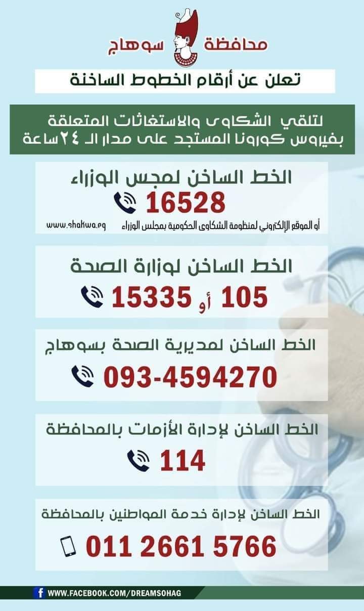 وجاءت الأرقام كالآتي الخط الساخن لإدارة الأزمات بالمحافظة 114 والخط الساخن لإدارة خدمة المواطنين بالمحافظة 01126615766 والخط الساخن لمديرية الشؤون الصحية بمحافظة سوهاج 0934594270.