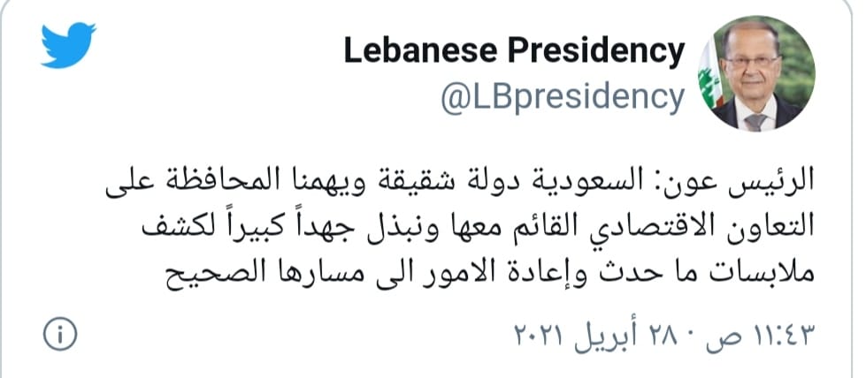 وقال عون، إن السعودية دولة شقيقة ويهمنا المحافظة على التعاون الاقتصادي القائم معها ونبذل جهدًا كبير لكشف ملابسات ما حدث وإعادة الأمور إلى مسارها الصحيح، وجاء ذلك بحضور وفدًا صناعيا ووزير الصناعة اللبناني عماد حب الله.