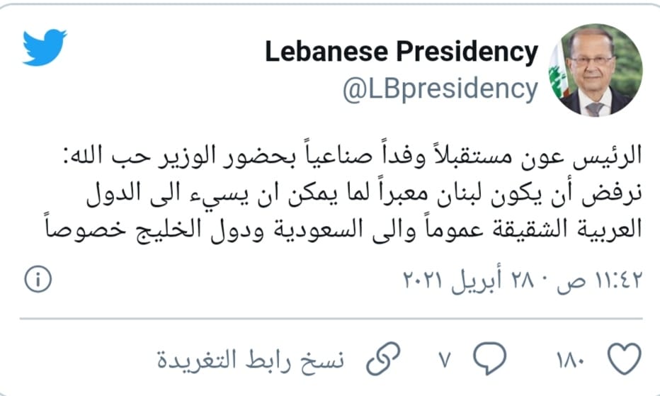 رفض الرئيس اللبناني، ميشال عون، أن تكون بلاده معبرًا لما يسيء إلى الدول العربية عموما والسعودية ودول الخليج خصوصا.