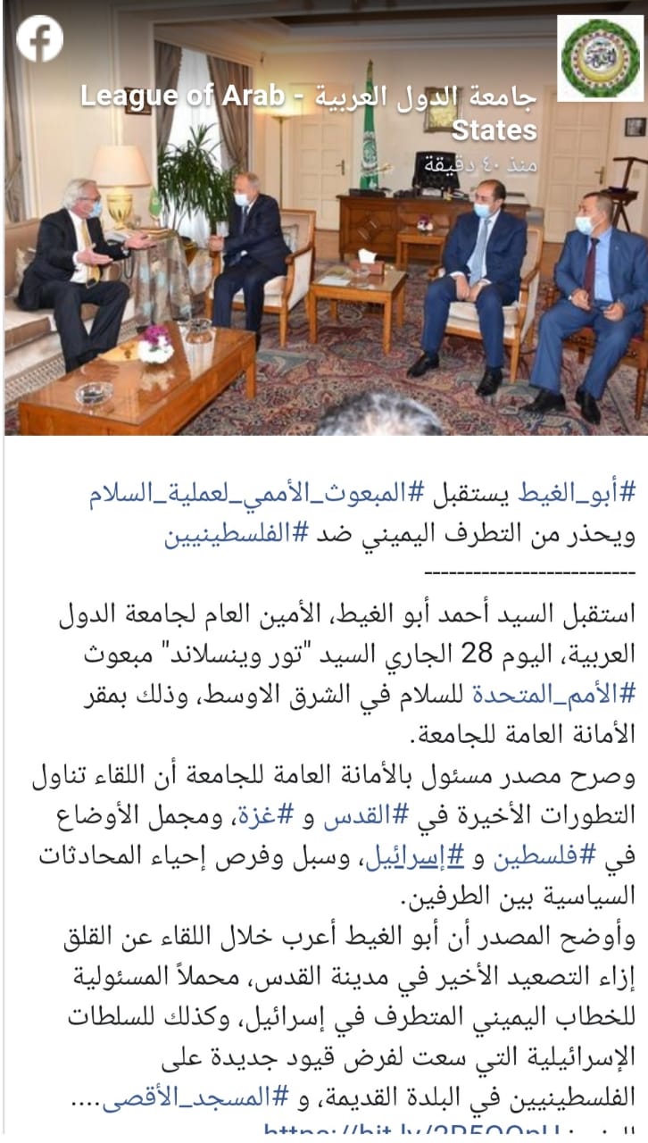 واستقبل أبو الغيط تور ورينسلاند مبعوث الأمم المتحدة للسلام في الشرق الأوسط في مقر الأمانة العامة للجمعية، وتناول اللقاء التطورات الأخيرة التي حدثت في فلسطين وخاصة مدينتي القدس وغزة، والأوضاع بين مصر وإسرائيل.