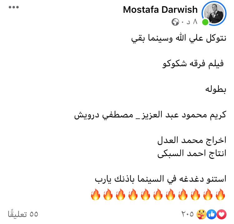 وكتب مصطفى درويش، منشورًا عبر حسابه الشخصي بموقع التواصل الاجتماعي “فيس بوك”: “نتوكل على الله وسينما بقي فيلم فرقة شكوكو بطولة كريم محمود عبد العزيز ومصطفى درويش.. استنوا دغدغة في السينما بإذنك يا رب”.