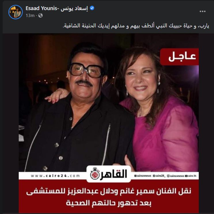 نشرت الفنانة والمنتجة إسعاد يونس عبر حسابها بموقع “فيس بوك”، خبر دخول النجم سمير غانم وزوجته الفنانة دلال عبدالعزيز المستشفى نقلًا عن "القاهرة 24".