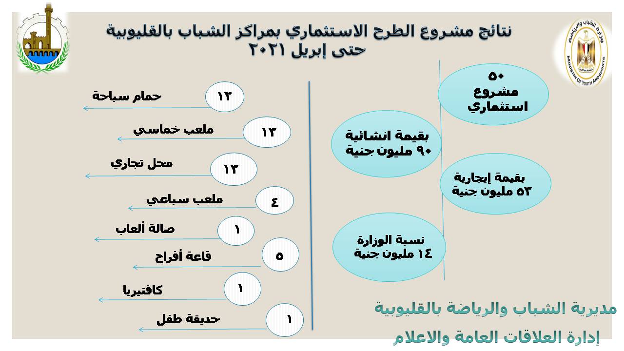 وأوضح الصبروط أن مشروعات الطرح الاستثماري بلغت القيمة الإنشائية لها بالقليوبية 90 مليون جنيه، لإجمالي 50 مشروعًا في 35 مركز شباب على مستوى المحافظة.