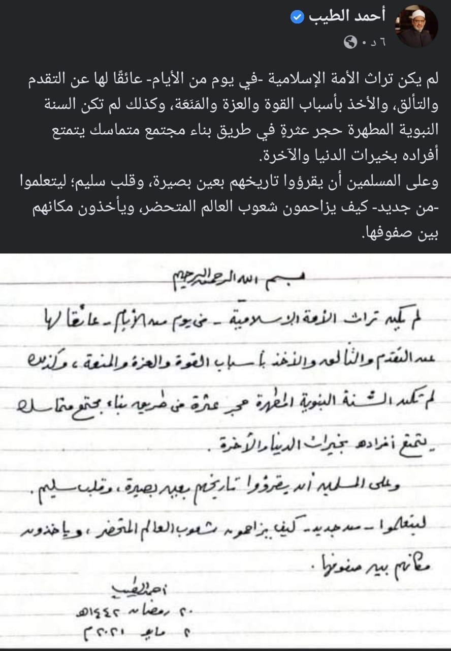 وكتب الطيب عبر تويتر “لم يكن تراث الأمة عائقا لها عن التقدم والتألق والأخذ بأسباب القوة والعزة والمنَعَة وكذلك لم تكن السنة النبوية المطهرة حجر عثرة في طريق بناء مجتمع متماسك يتمتع أفراده بخيرات الدنيا والآخرة، وعلى المسلمين أن يقرؤوا تاريخهم بعين بصيرة ليتعلموا من جديد كيف ينافسون شعوب العالم المتحضر”.