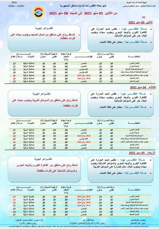 - حالة الطقس نهارًا شديد الحرارة على القاهرة الكبرى والوجه البحري وجنوب سيناء وجنوب البلاد، حار على السواحل الشمالية. حالة الطقس ليلا: معتدل على كافة الأنحاء.