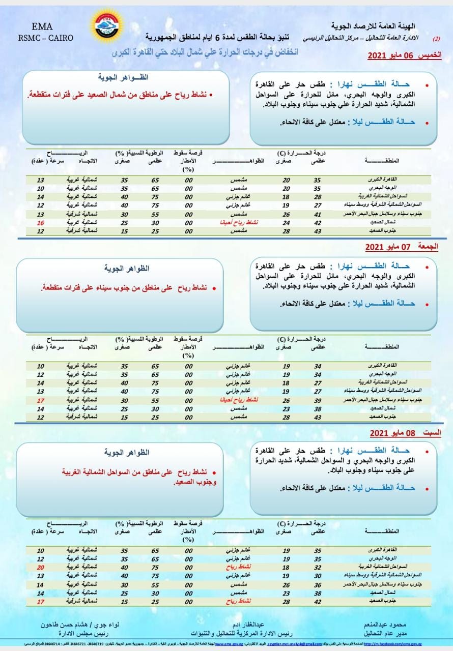 - حالة الطقس نهارا حار على القاهرة الكبرى والوجه البحري و السواحل الشمالية، شديد الحرارة على جنوب سيناء وجنوب البلاد حالة الطقس ليلًا معتدل على كافة الأنحاء