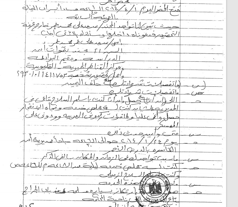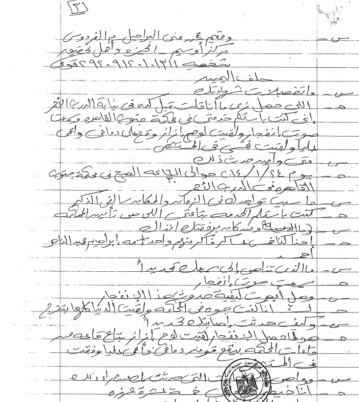 ج: اللي حصل انى كنت متواجد في غرفة عمليات النجدة بالدور السادس بالمديرية وفجاة حدث انفجار أدي إلى سقوطي على الأرض من أعلى الكرسي بجوار غرفه العمليات مما أدى إلى أحداث إصابتي حسيته بزلزال كبير .