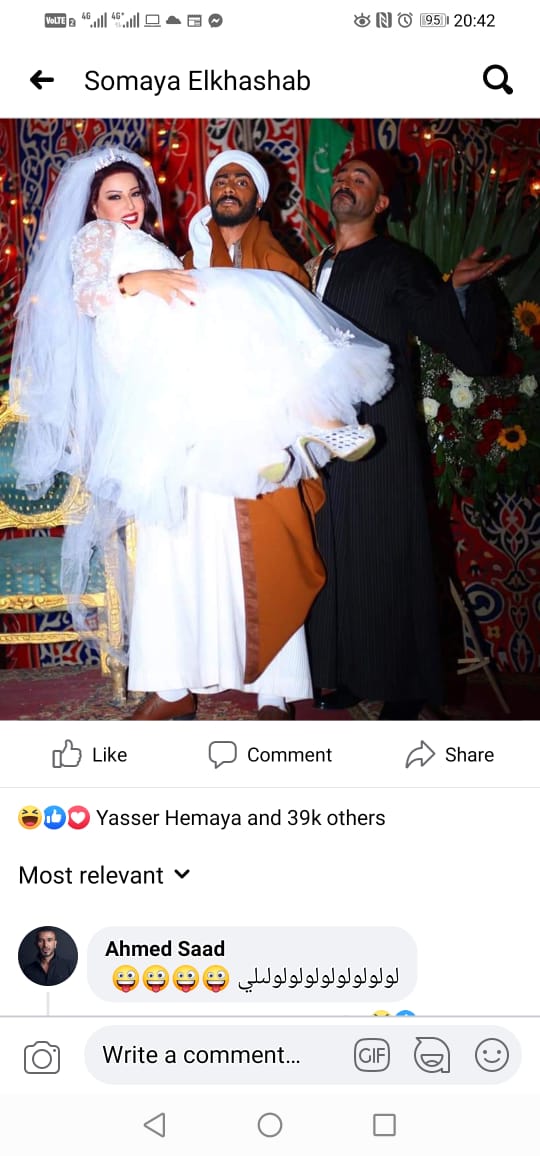ومن جانبه رد أحمد سعد على هذه الصورة من خلال تعليق على صفحة سمية الخشاب، وكتب مازحا ليطلق زغرودة على الصورة "لولولي".