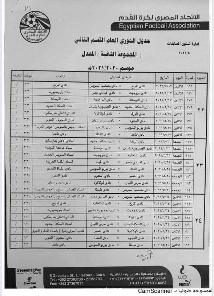 عدلت لجنة المسابقات بدوري الممتاز ب مواعيد مباريات المجموعة الثانية القاهرة والقناة، والتي تضم 16 فريقًا لهذا الموسم، لتبدأ منافسات الجولة 22 في 17 مايو عقب نهاية إجازة عيد الفطر، على أن تنتهي منافسات المجموعة بأكملها في 21 يونيو المقبل.