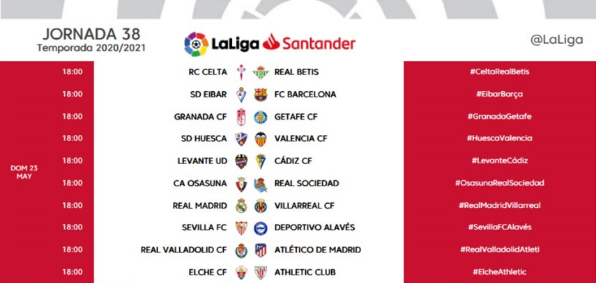 أعلن الاتحاد الإسباني لكرة القدم، مواعيد مباريات الجولة الثامنة والثلاثون والأخيرة من مسابقة الدوري الإسباني، والتي ستقام بالكامل في نفس التوقيت.