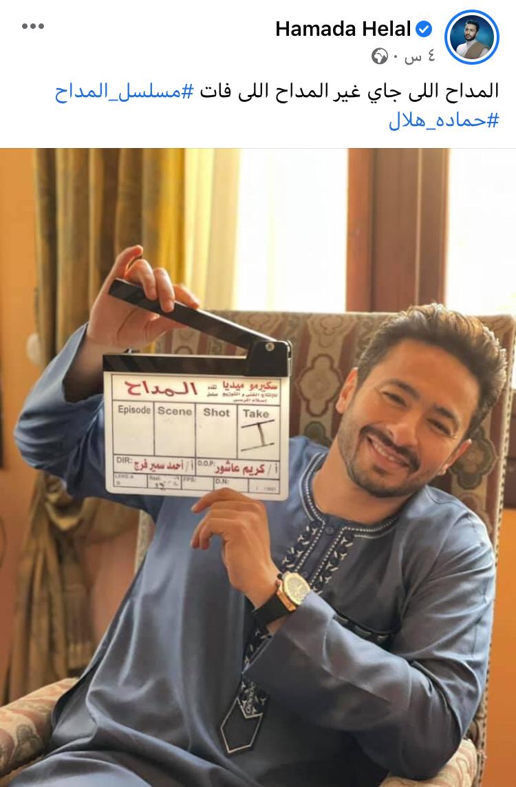 شارك الفنان حمادة هلال جمهوره بصورة له من كواليس تصوير مسلسل "المداح"، حرص من خلالها على تشويق جمهوره للحلقات المقبلة من المسلسل.
