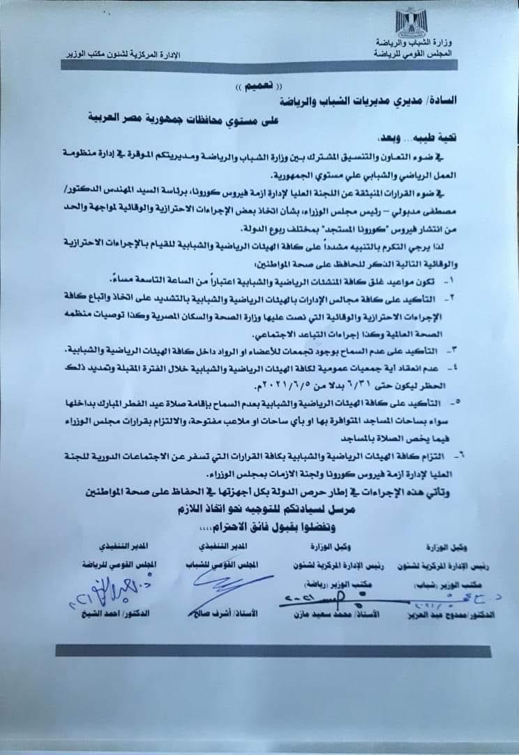 وشددت وزارة الشباب والرياضة في توجيهها بالتنبيه على كافة الهيئات الرياضية والشبابية للقيام بالإجراءات الاحترازية والوقائية التالية الذكر للحافظ على صحة المواطنين، أن تكون مواعيد غلق كافة المنشآت الرياضية والشبابية، اعتبارًا من الساعة التاسعة مساء، والتأكيد على كافة مجالس الإدارات بالهيئات الرياضية والشبابية بالتشديد على اتخاذ واتباع كافة الإجراءات الاحترازية والوقائية التي نصت عليها وزارة الصحة والسكان المصرية وكذا توصيات منظمه الصحة العالمية.