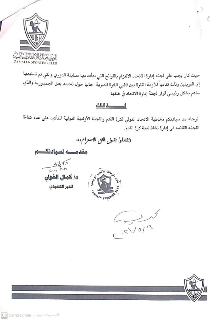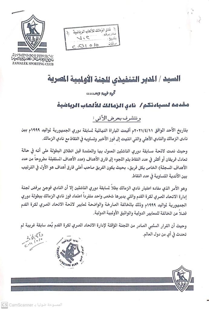 تقدمت اللجنة المكلفة بإدارة نادي الزمالك، بخطاب إلى اللجنة الأولمبية المصرية تستعرض فيه المخالفات التي قامت بها اللجنة الثلاثية المكلفة بإدارة اتحاد الكرة المصري، بخصوص بطولة الجمهورية 99، والتي شهدت مخالفة واضحة للوائح المنظمة للبطولة بعدم منح الزمالك لقب بطولة 99 بحسب اللائحة التي تنصف الزمالك.