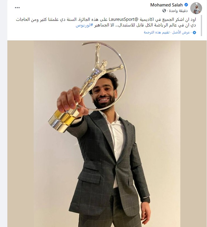 أول تعليق من محمد صلاح بعد الفوز بجائزة لوريوس العالمية