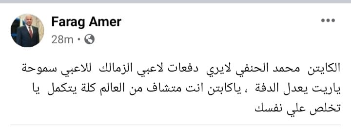 وكتب عامر عبر حسابه الشخصي على موقع التواصل الاجتماعي "فيس بوك": "الكابتن محمد الحنفي لا يري دفعات لاعبي الزمالك للاعبي سموحة ياريت يعدل الدفة".
