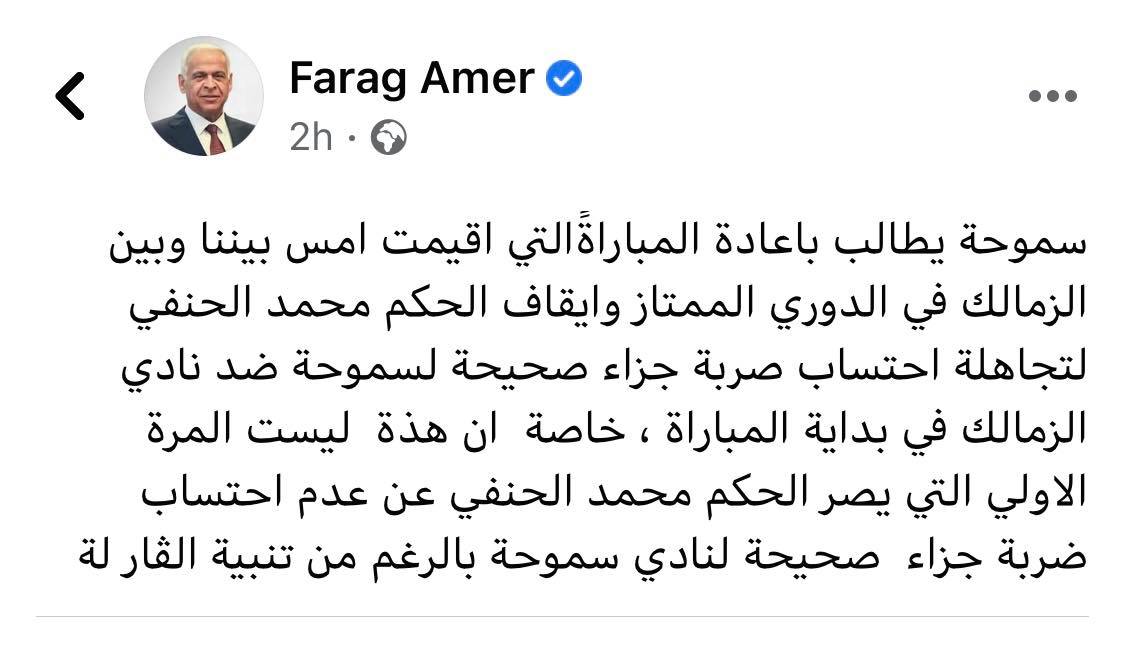 وقال فرج عامر، عبر حسابه الشخصي على موقع التواصل الاجتماع “فيس بوك": "سموحة يطالب بإعادة المباراة التي أقيمت أمس بيننا وبين الزمالك في الدوري الممتاز، وإيقاف الحكم محمد الحنفي لتجاهله احتساب ركلة جزاء صحيحة لسموحة ضد نادي الزمالك في بداية المباراة".