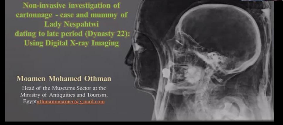 ألقى مؤمن عثمان، رئيس قطاع المتاحف بوزارة السياحة والآثار، عبر تطبيق زوم، محاضرة عن الفحوصات العلمية لمومياء سيدة تدعى "نسبا حتوي" من الأسرة 22 من العصر المتأخر باستخدام الأشعة السينية، وذلك بدعوة من معهد الطب التطوري بجامعة “zurich” بسويسرا تحت عنوان “الأساليب المتقدمة غير المتلفة المستخدمة في دراسة المومياوات” التي حضرها عدد من أساتذة الجامعة.