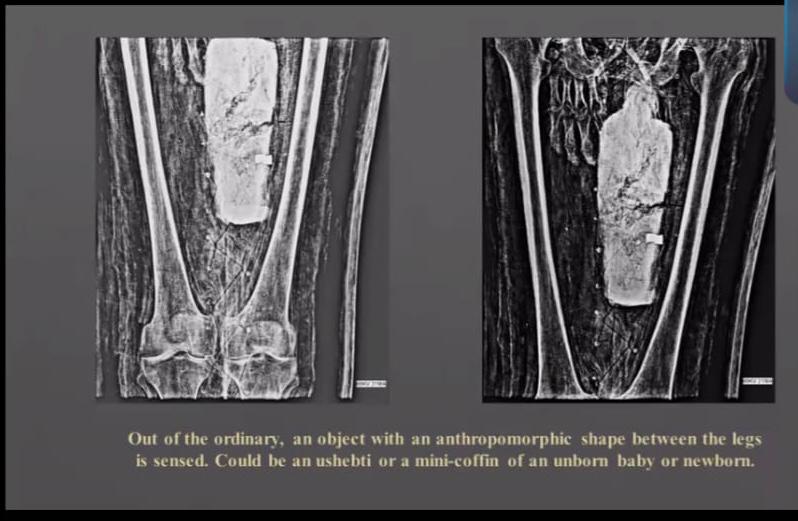 وأشار عثمان إلى أن عملية الفحص أوضحت أن عمر المومياء قبل الوفاة كان يتراوح بين 22 و25 عامًا وأنها توفيت أثناء الولادة، حيث وجد مجسم لتابوت صغير بين الساقين يرجح أنه لجنين أو لطفل حديث الولادة.