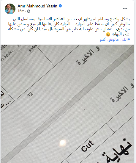 وكتب ياسين على حسابه الشخصي بـ"فيس بوك": “بشكل واضح ومباشر لم يظهر أي حد من العناصر الأساسية بمسلسل اللي مالوش كبير أي تحفظ على النهاية.. النهاية كان يعلمها الجميع و متفق عليها من بدري .. عشان مش عارف ليه داير في السوشيال ميديا إن كان في مشكله على النهاية”.