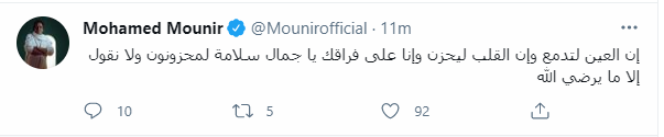 وكتب الكينج، على حسابه بموقع التغريدات القصيرة "تويتر": "إن العين لتدمع وإن القلب ليحزن وإنا على فراقك يا جمال سلامة لمحزنون ولا نقول إلا ما يرضي الله".