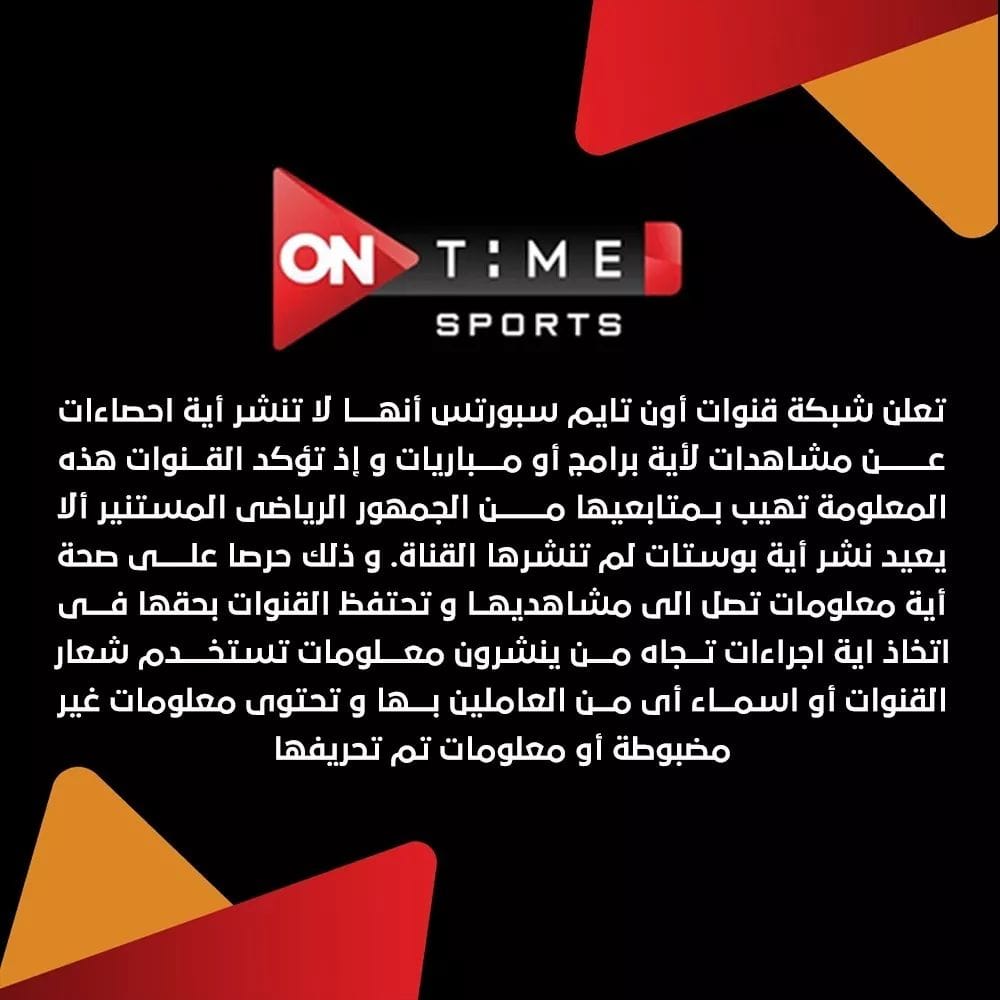 ونشرت قناة أون تايم سبورت بيانًا لها عبر شاشتها تقول خلاله: "تعلن شبكة أون تايم سبورت أنها لا تنشر أي إحصاءات عن مشاهدات لأي برامج أو مباريات، وإذ تؤكد القنوات هذه المعلومة تهيب بمتابعيها من الجمهور الرياضي المستنير، ألا يعيد نشر أي بوستات لم تنشرها القناة، وذلك حرصا على صحة أي معلومات تصل إلى مشاهديها وتحتفظ القنوات بحقها في أي اتخاذ أي إجراءات تجاه من ينشرون معلومات تستخدم شعار القنوات أو أسماء أي من العاملين بها، وتحتوي معلومات غير مضبوطة، أو معلومات تم تحريفها".