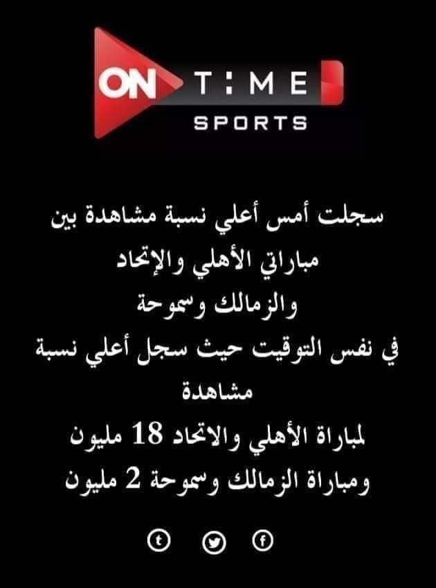 علقت قناة أون تايم سبورت على حقيقة الصورة المنتشرة بشأن نسبة مشاهدة مباراة الأهلي والاتحاد السكندري والزمالك وسموحة، في المباراتين اللتين أقيمتا في الدوري الممتاز الخميس.