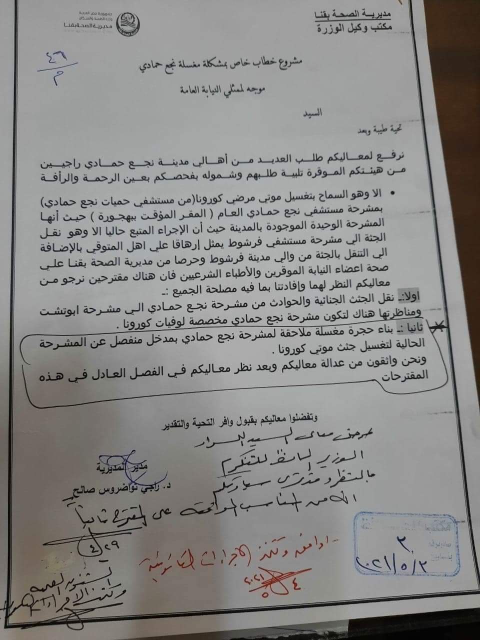 وجهت مديرية الصحة بقنا، خطابا إلى النيابة العامة، للمطالبة بالسماح بتغسيل موتى كورونا بمستشفى حميات نجع حمادي، في مستشفى مشىرحة مستشفى نجع حمادي العام بالمقر المؤقت ببهجورة بدلا من الإجراء المتبع حاليا وهو نقل الجثة إلى مشرحة مستشفى فرشوط، وهو ما يمثل إرهاقا على أهل المتوفي.