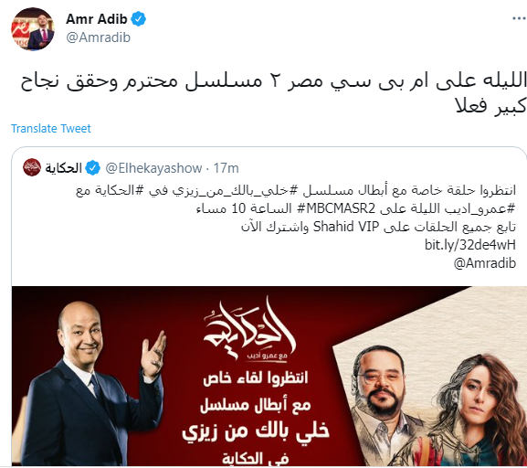 وكتب أديب تغريدة عبر حسابه الرسمي بموقع التدوينات القصيرة "تويتر"، مغردًا: "الليلة على إم بي سي مصر 2 مسلسل محترم وحقق نجاحا كبيرا فعلاً".