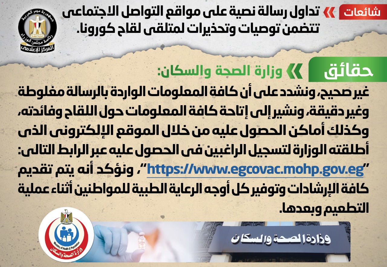 تداولت بعض صفحات التواصل الاجتماعي رسالة نصية تتضمن توصيات وتحذيرات لمتلقي لقاح كورونا، حيث تواصل المركز الإعلامي لمجلس الوزراء بالتواصل مع وزارة الصحة والسكان، والتي نفت تلك الأنباء، مُؤكدةً أنه لا صحة للرسالة النصية المتداولة على مواقع التواصل الاجتماعي، والتي تتضمن توصيات وتحذيرات لمتلقي لقاح كورونا، مُشددةً على أن كافة المعلومات الواردة بالرسالة مغلوطة وغير دقيقة.