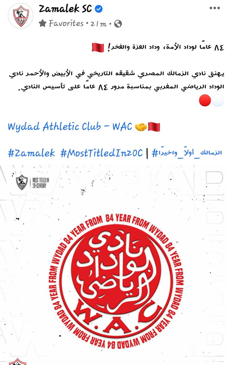وواصلت يهنئ نادي الزمالك المصري شقيقه التاريخي في الأبيض والأحمر نادي الوداد الرياضي المغربي بمناسبة مرور 84 عامًا على تأسيس النادي.