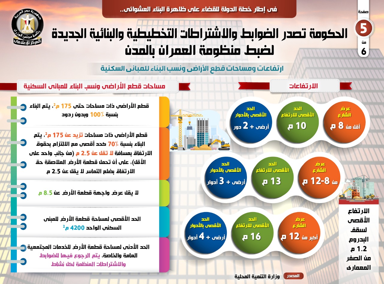 وفي هذا الصدد، نشر المركز الإعلامي لمجلس الوزراء، تقريراً تضمن إنفوجرافات تسلط الضوء على الضوابط والاشتراطات التخطيطية والبنائية الجديدة التي أصدرتها الحكومة لضبط منظومة العمران بالمدن، وذلك في إطار خطة الدولة للقضاء على ظاهرة البناء العشوائي.