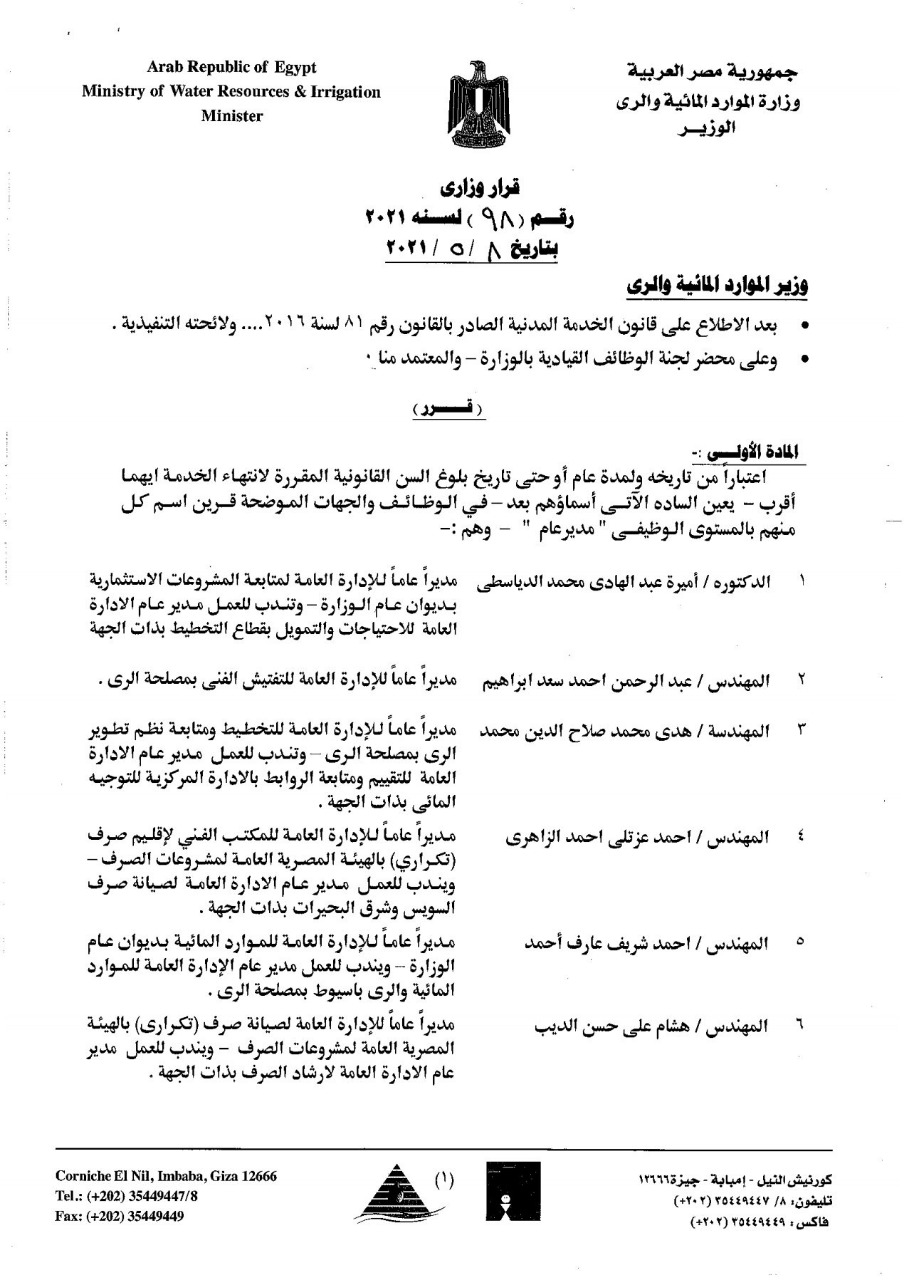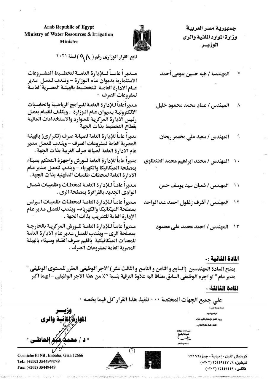 أصدر الدكتور محمد عبد العاطي، وزير الموارد المائية والري، قرارًا وزاريًا بتعيين عدد من الدكاترة والمهندسين في وظائف مهمة بالمستوى الوظيفي مدير عام.