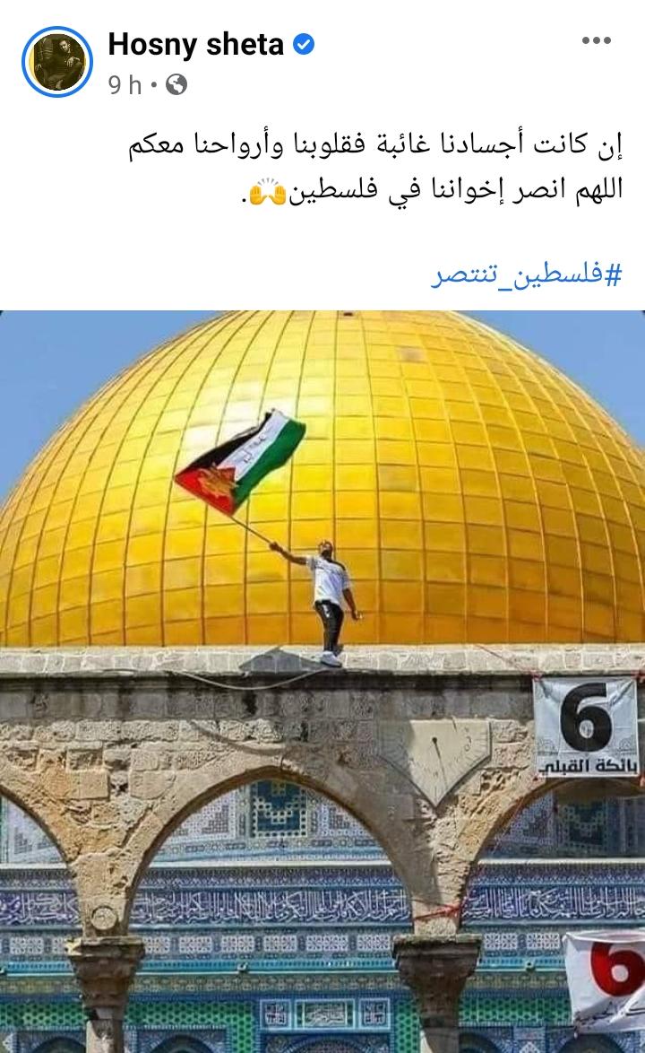كما تفاعل الفنان حسني شتا، مع هاشتاج القدس تنتصر، حيث كتب عبر فيس بوك: "إن كانت أجسادنا غائبة فقلوبنا وأرواحنا معكم، اللهم انصر إخواننا في فلسطين، فلسطين تنتصر".