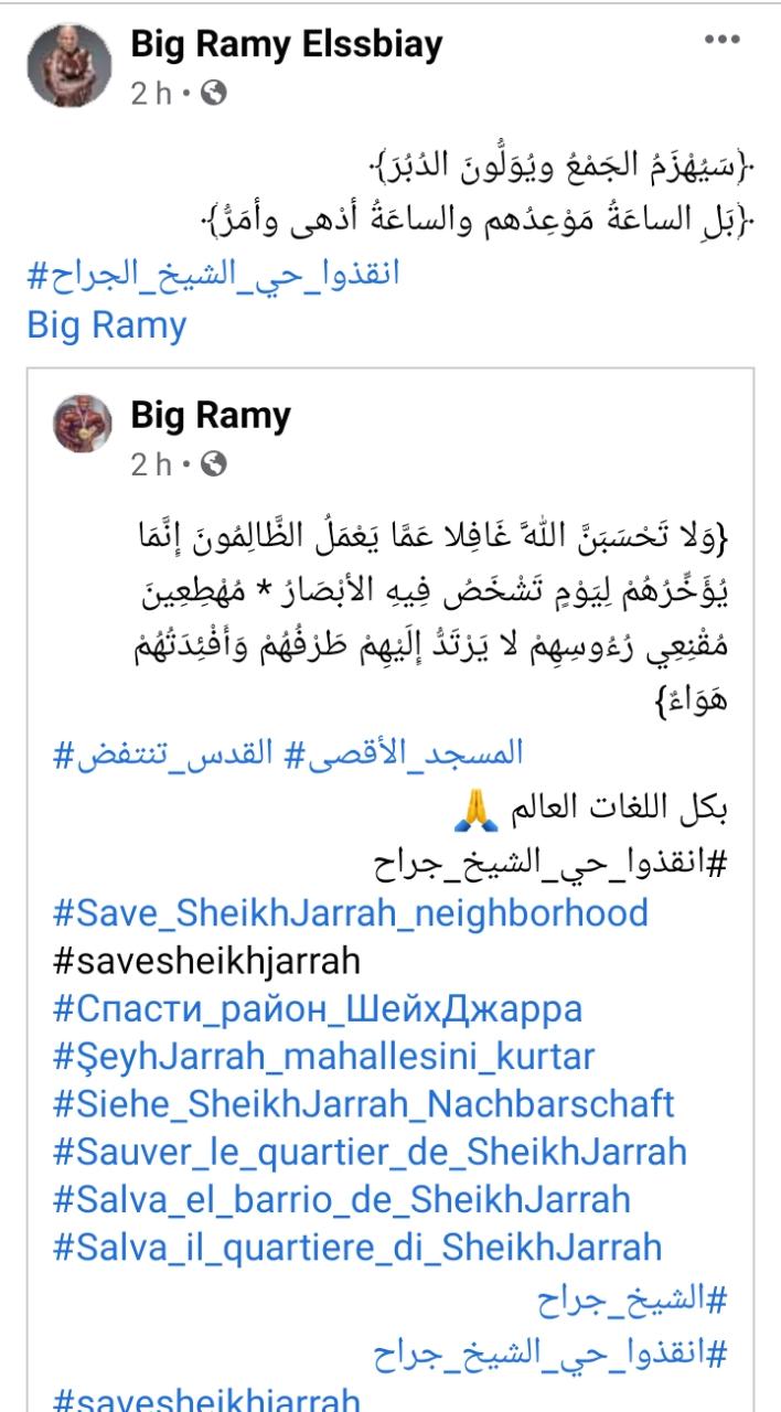 وأعلن البيج رامي، تعاطفه مع الشعب الفلسطيني، فقال :" " وَلا تَحْسَبَنَّ اللَّهَ غَافِلا عَمَّا يَعْمَلُ الظَّالِمُونَ إِنَّمَا يُؤَخِّرُهُمْ لِيَوْمٍ تَشْخَصُ فِيهِ الأبْصَارُ * مُهْطِعِينَ مُقْنِعِي رُءُوسِهِمْ لا يَرْتَدُّ إِلَيْهِمْ طَرْفُهُمْ وَأَفْئِدَتُهُمْ هَوَاءٌ"، مضيفًا هاشتاج "أنقذوا حي الشيخ جراح"، وهاشتاج "لن نرحل".