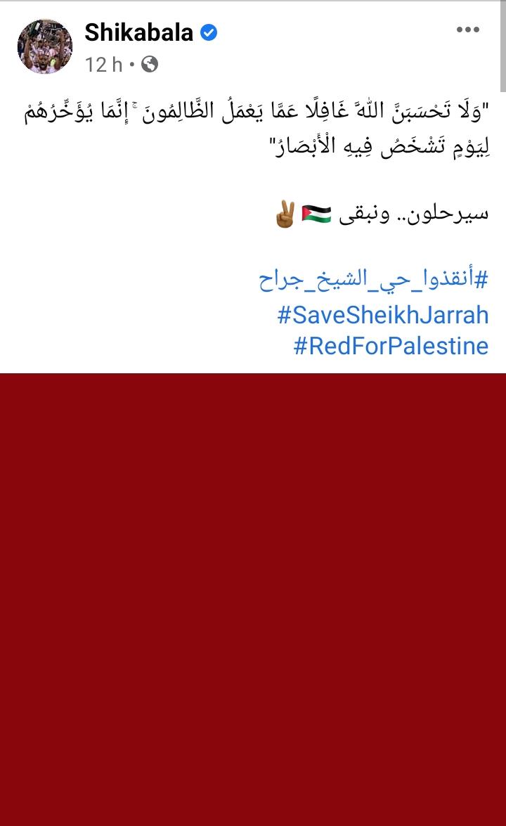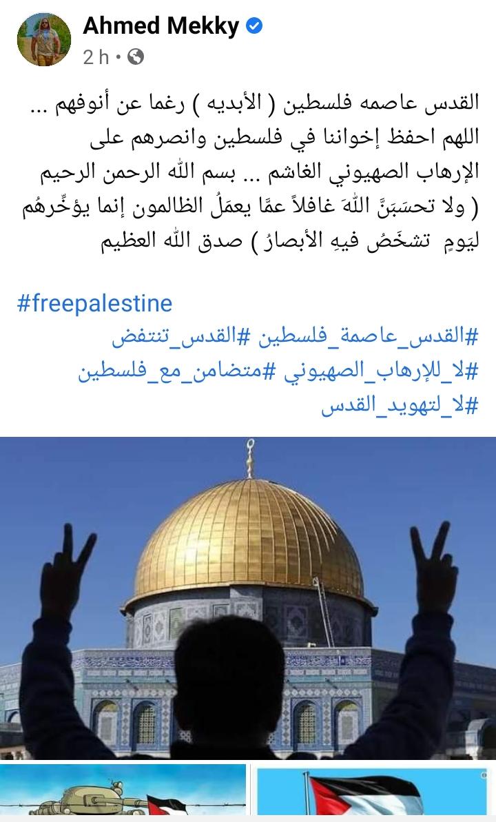 بالإضافة إلى محمد فراج، الذي كتب عبر صفحته على الفيس بوك، “قلوبنا مع أهلنا في فلسطين.. القدس عربية مهما حاول الاحتلال.. أنقذوا حي الشيخ جراح".