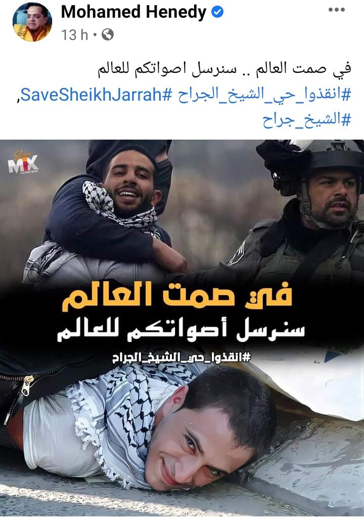 وفي منشور آخر، أضاف هنيدي: "في صمت العالم، سنرسل أصواتكم للعالم"، مستخدمًا هاشتاج "أنقذوا حي الشيخ جراح".