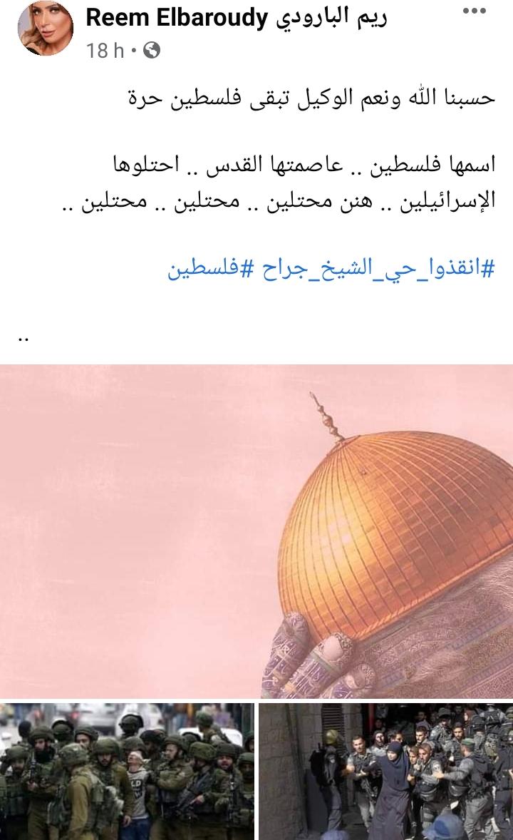 بينما كتبت الفنانة ريم البارودي، أيضًا عبر حسابها على فيس بوك: "حسبنا الله ونعم الوكيل، تبقى فلسطين حرة، اسمها فلسطين، عاصمتها القدس، احتلوها الإسرائيلين، هنن محتلين.. محتلين.. محتلين، أنقذوا حي الشيخ جراح".