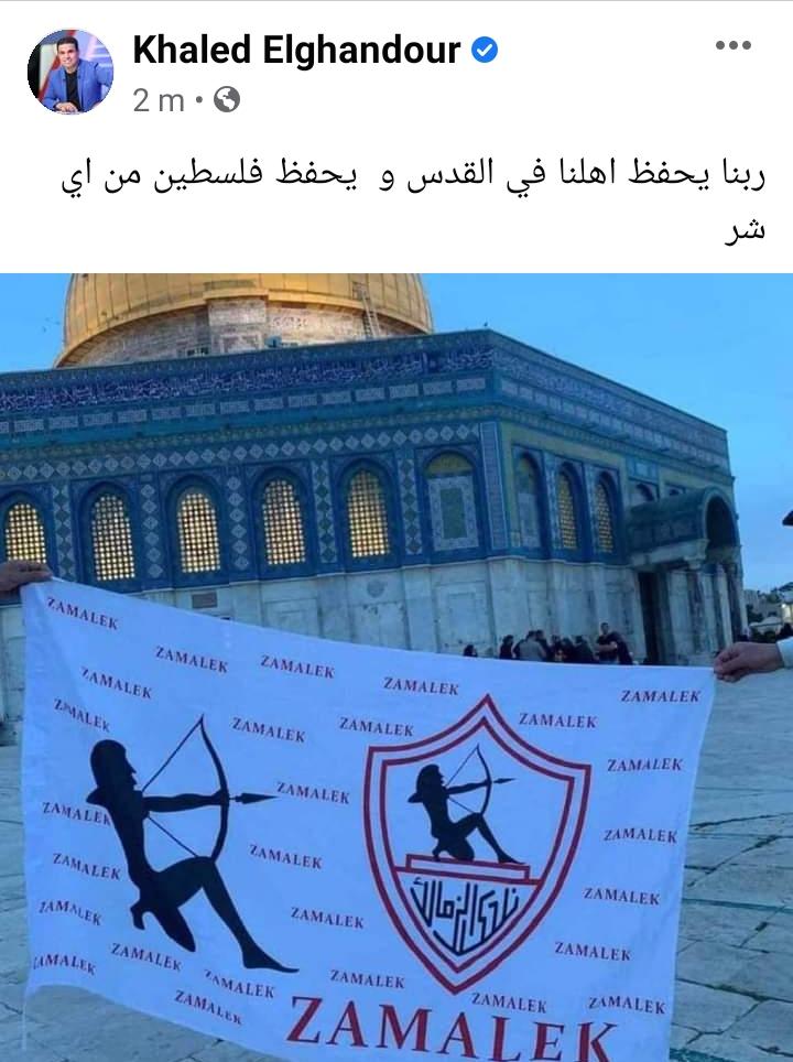 وقال الإعلامي خالد الغندور، لاعب الزمالك السابق، عبر حسابه على فيس بوك: "ربنا يحفظ أهلنا في القدس، ويحفظ فلسطين من أي شر"، مع صورة مرفقة بعلم نادي الزمالك أمام مسجد قبة الصخرة.