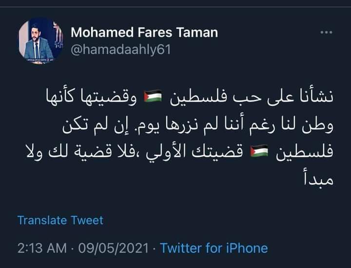 وغرد الإعلامي محمد فارس تمان، مذيع قناة النادي الأهلي عبر تويتر، فقال: "نشأنا على حب فلسطين، وقضيتها كأنها وطن لنا رغم أننا لم نزرها يومًا، القدس عربية وستبقى كذلك".