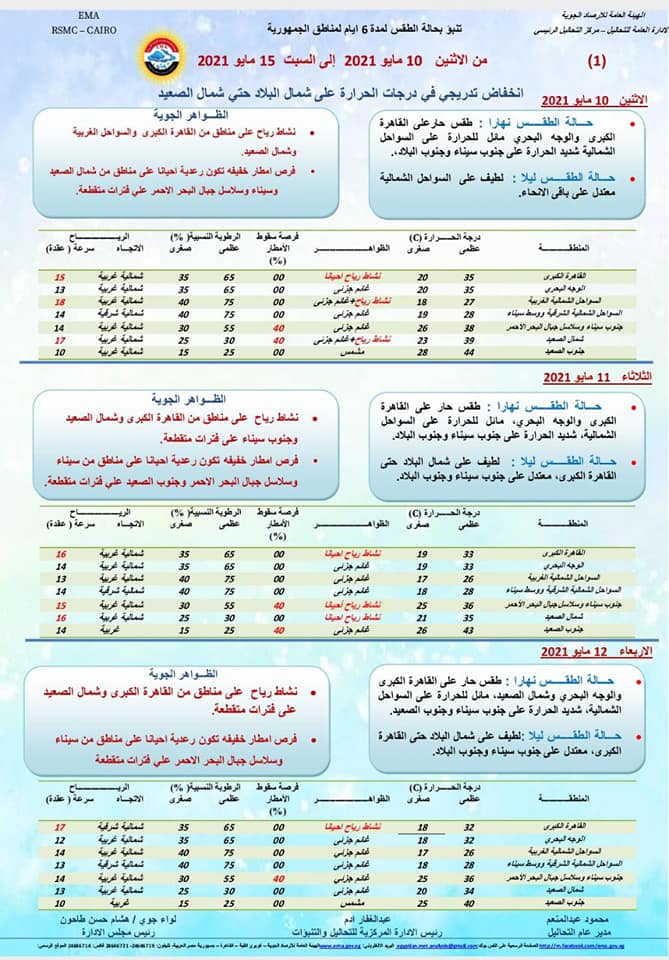 وتتوقع الهيئة أن يسود الاثنين 10 مايو، طقس حار على القاهرة الكبرى والوجه البحري مائل للحرارة على السواحل الشمالية شديد الحرارة على جنوب سيناء وجنوب البلاد، فيما يسود طقس لطيف ليلا على السواحل الشمالية معتدلا على باقي الأنحاء.