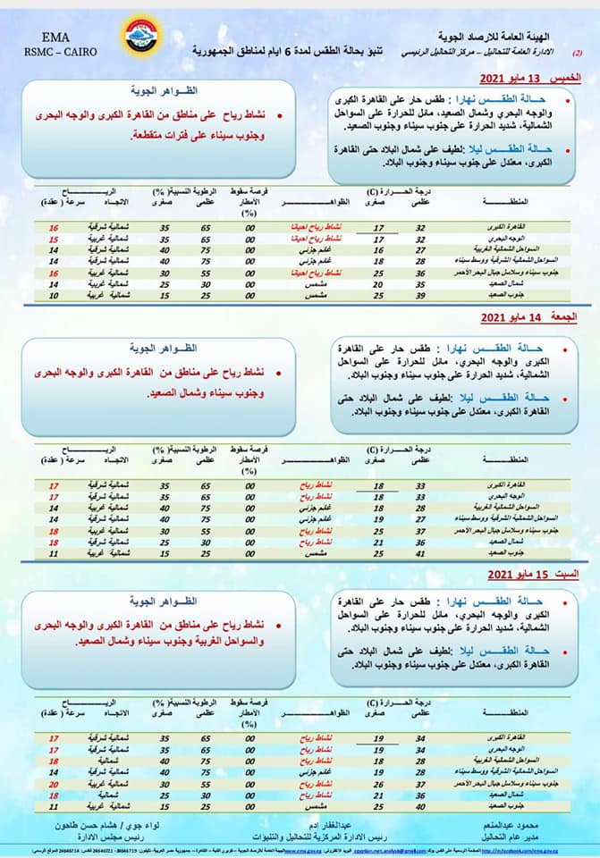 كما يصاحب ذلك نشاط للرياح على مناطق من القاهرة الكبرى وشمال الصعيد وجنوب سيناء على فترات متقطعة، مع فرصة هطول أمطار خفيفة تكون رعدية أحيانا على مناطق من سيناء وسلاسل جبال البحر الأحمر وجنوب الصعيد على فترات متقطعة.