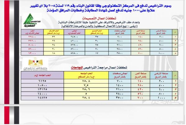 - إجمالي مسطحات 2100 متر "أرضي + 4 أدوار" تكون الرسوم 25 جنيها عن كل متر مقابل إعداد التصميمات، و24 جنيها عن كل متر مقابل الإشراف على التنفيذ.