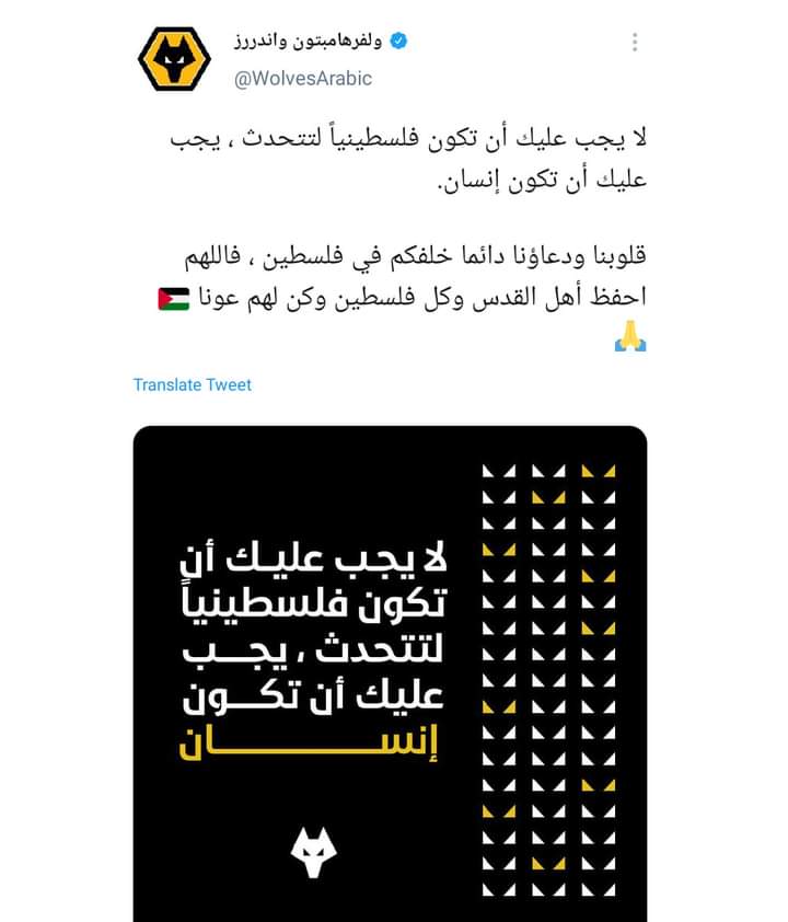 أعلن نادي نادي ولفرهامبتون واندررز الإنجليزي تضامنه مع الشعب الفلسطيني من خلال تغريدة نشرها الحساب الرسمي للفريق، عبر موقع التدوينات الصغيرة تويتر.