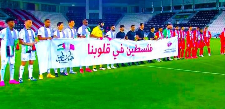 حمل لاعبو فريقي السد والعربي القطري لافتة بعنوان "فلسطين في قلوبنا"، وذلك قبل انطلاق مباراة نصف نهائي كأس قطر.