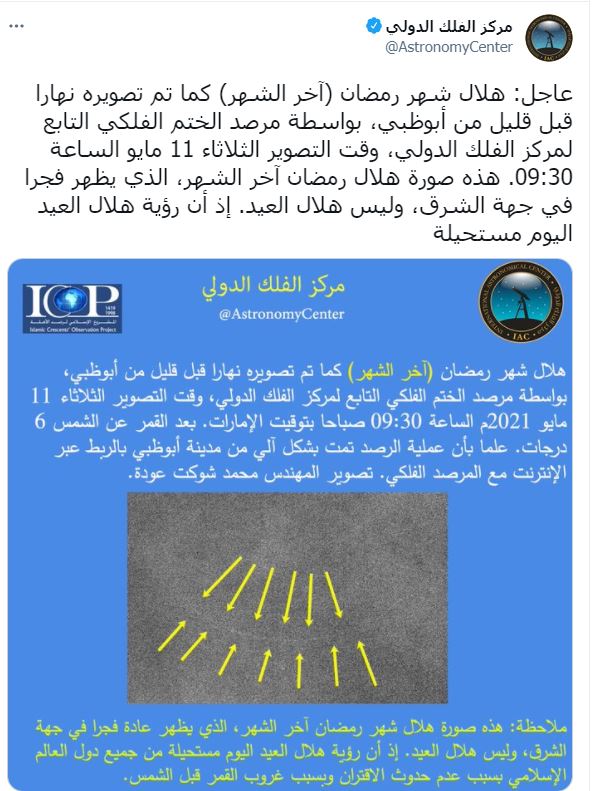 وأكد مركز الفلك الدولي أنه ليس هلال عيد الفطر، إذ إنّ رؤية الهلال اليوم مستحيلة، من جميع مناطق العالم الإسلامي، بسبب عدم حدوث الاقتران، وغروب القمر قبل الشمس.