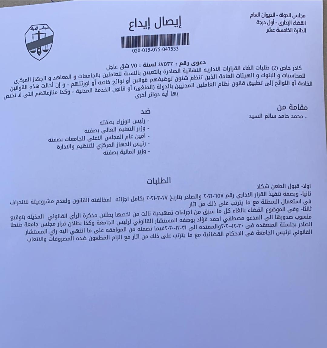 واختصمت الدعوى التي حملت رقم 47533 لسنة 75 ق كلا من رئيس الوزراء بصفته ووزير التعليم العالي، وأمين عام المجلس الأعلى للجامعات، ووزير المالية، ورئيس جامعة طنطا وآخرين، واستندت الدعوى على أن القرار المطعون فيه الصادر من رئيس جامعة طنطا صدر بالمخالفة للقانون ولحكم المحكمة الإدارية 5868 لسنة 45 ق إدارية طنطا ومشوبا بالغش والتدليس وموصوم بعد المشروعية.
