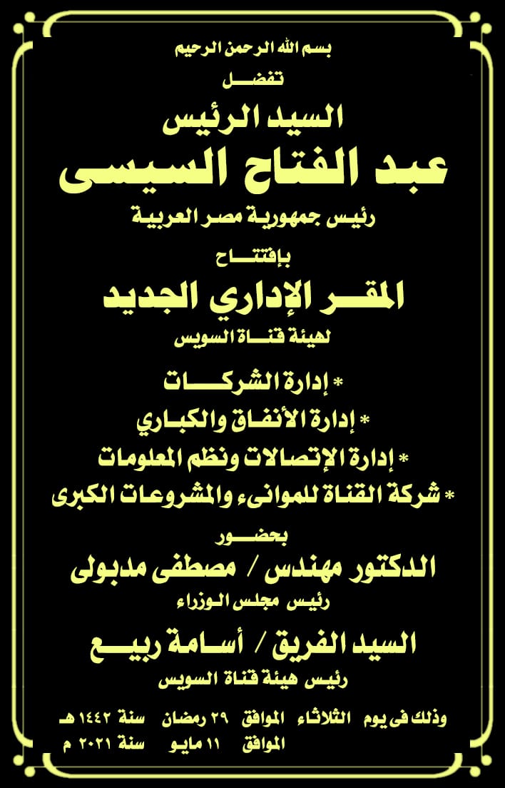 افتتح الرئيس عبد الفتاح السيسي مقر الأنفاق والكباري، في مدينة الإسماعيلية الجديدة، وذلك بحضور الدكتور مصطفى مدبولي رئيس الوزراء والفريق أسامة ربيع رئيس هيئة قناة السويس، والفريق مهاب مميش مستشار الرئيس للمشروعات محور قناة السويس.