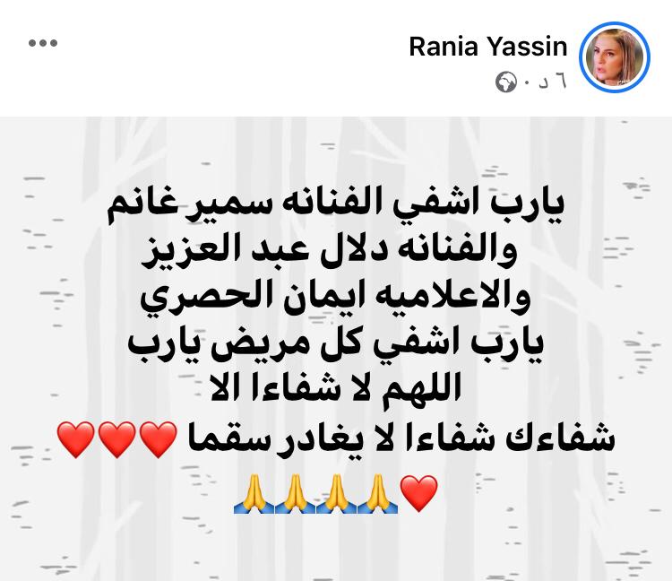 وكتب رانيا منشورًا، عبر حسابها الرسمي بموقع التواصل الاجتماعي "فيس بوك"، قائلةً: "يارب اشفي الفنان سمير غانم والفنانة دلال عبد العزيز، والإعلامية إيمان الحصري".
