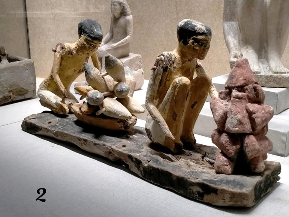 2- قطعة تمثل نموذجًا خشبيًّا يرجع لعصر الدولة الوسطى يصور صناعة الخبز في مصر القديمة، حيث يقوم الشخص بالخلف بعمل عجين الخبز ووضعه في قالب الخبز ويعطيه للشخص الأمامي لوضعه في الفرن المصور أمامه.