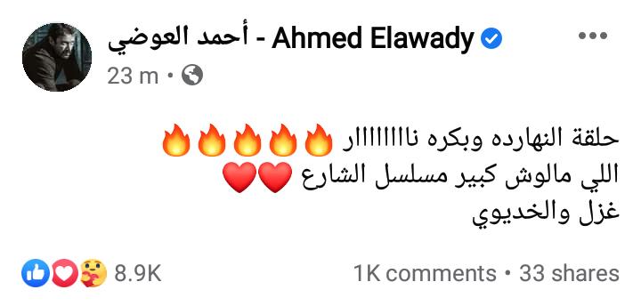 ونشر العوضي بحسابه الرسمي عبر موقع التواصل الاجتماعى "فيسبوك"، قائلًا: "حلقة النهاردة وبكرة ناااار.. اللي مالوش كبير مسلسل الشارع.. غزل والخديوي".